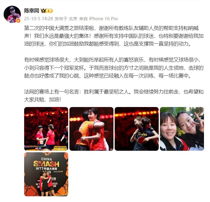 直播吧10月5日讯在2025年WTT中国大满贯女单和女双两项比赛中,陈幸同均止步半决赛。陈幸同在社媒分享本次中国大满贯比赛照片,并发文向球迷致谢,表示自己将会继续努力,和大家共勉。